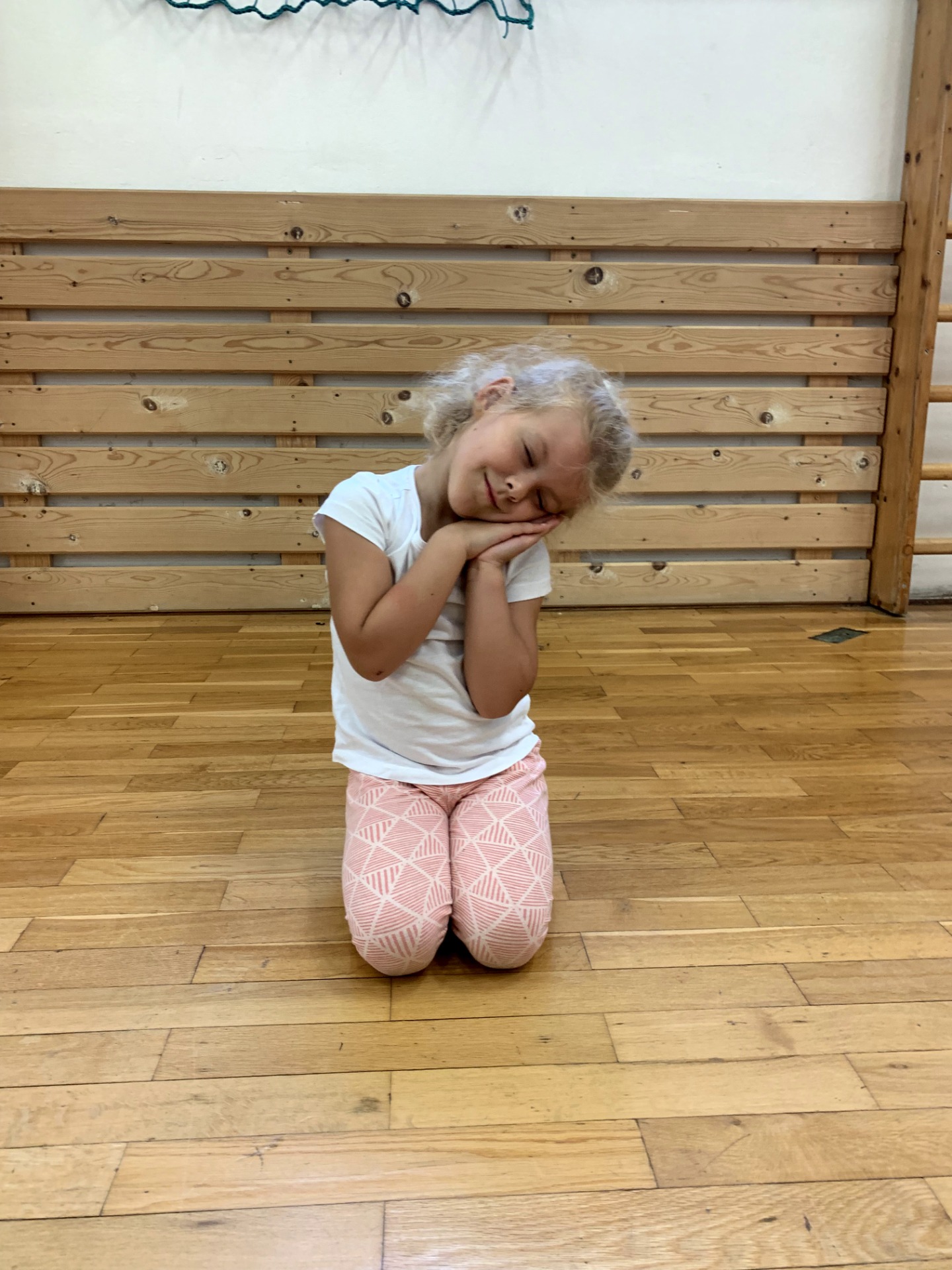 Klek sedmo - skrčit připažmo, dlaně spojit, ruce na L/P rameno - úklon hlavy L/P