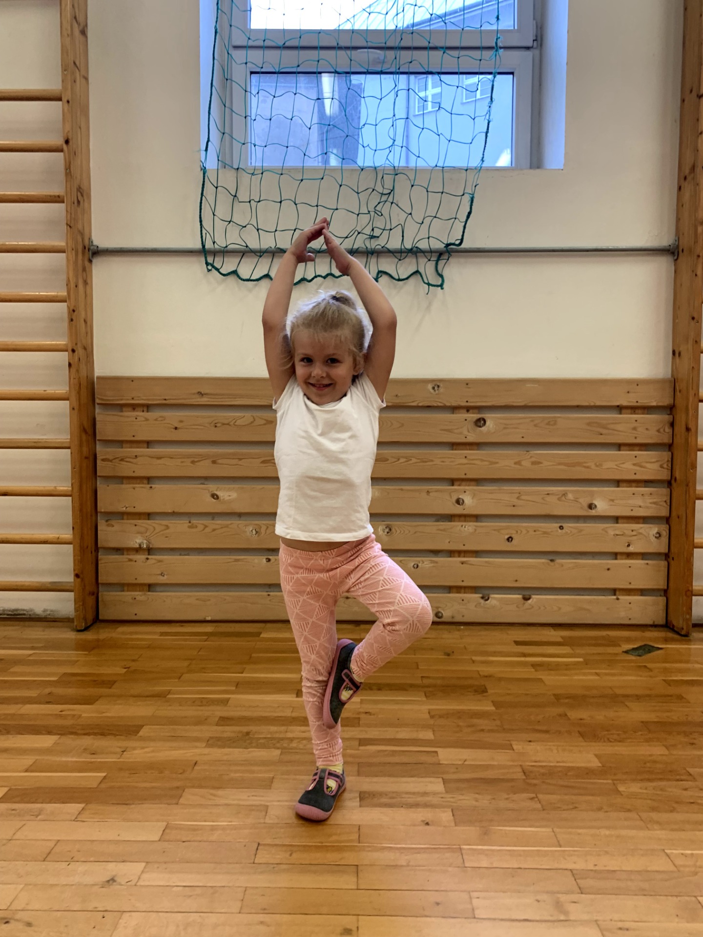 Stoj na L/P - pokrčit únožmo poníž P/L - pokrčit vzpažmo zevnitř, dlaně spojit (stříška)